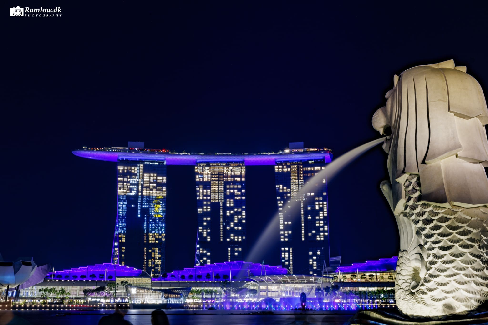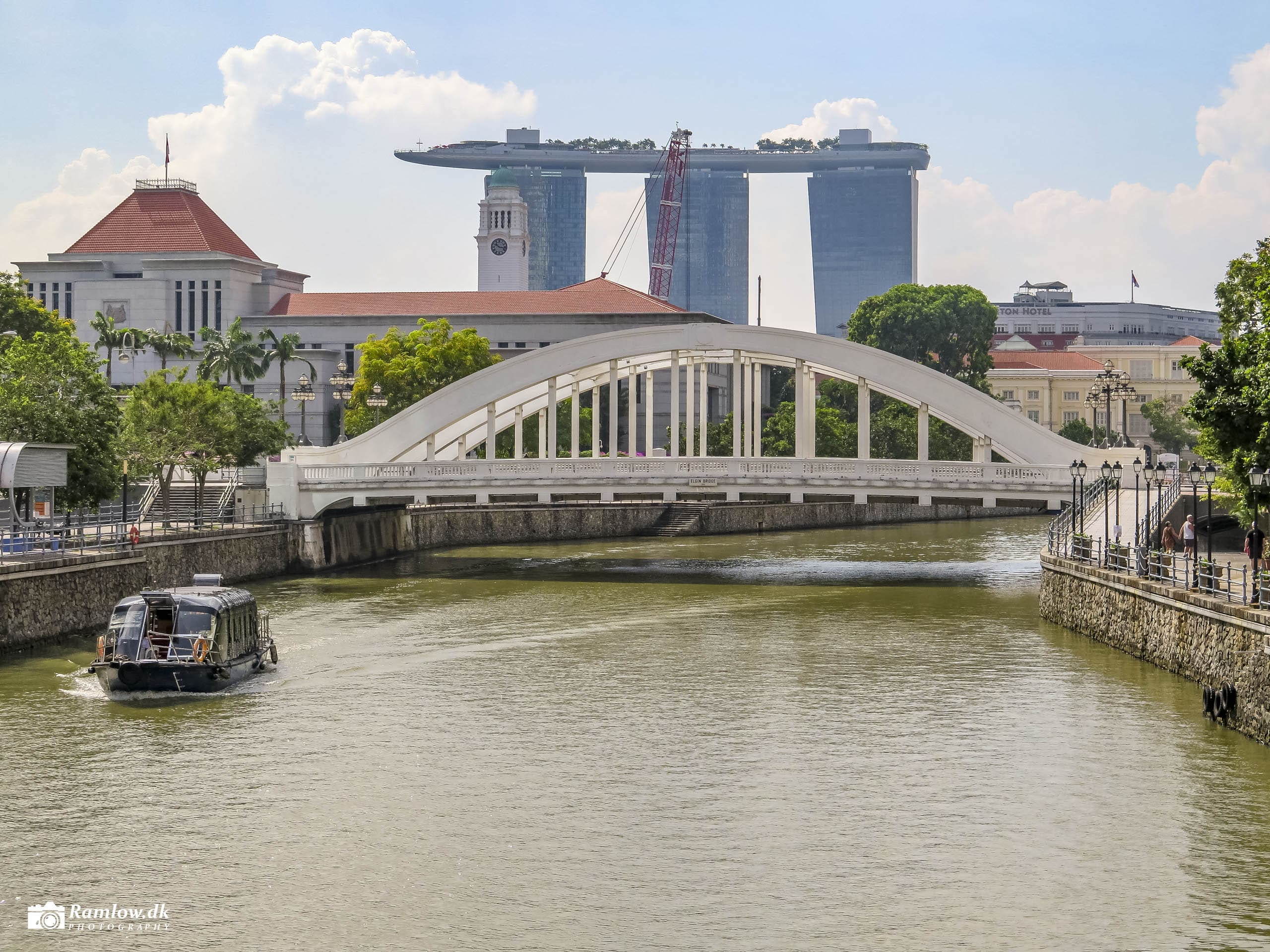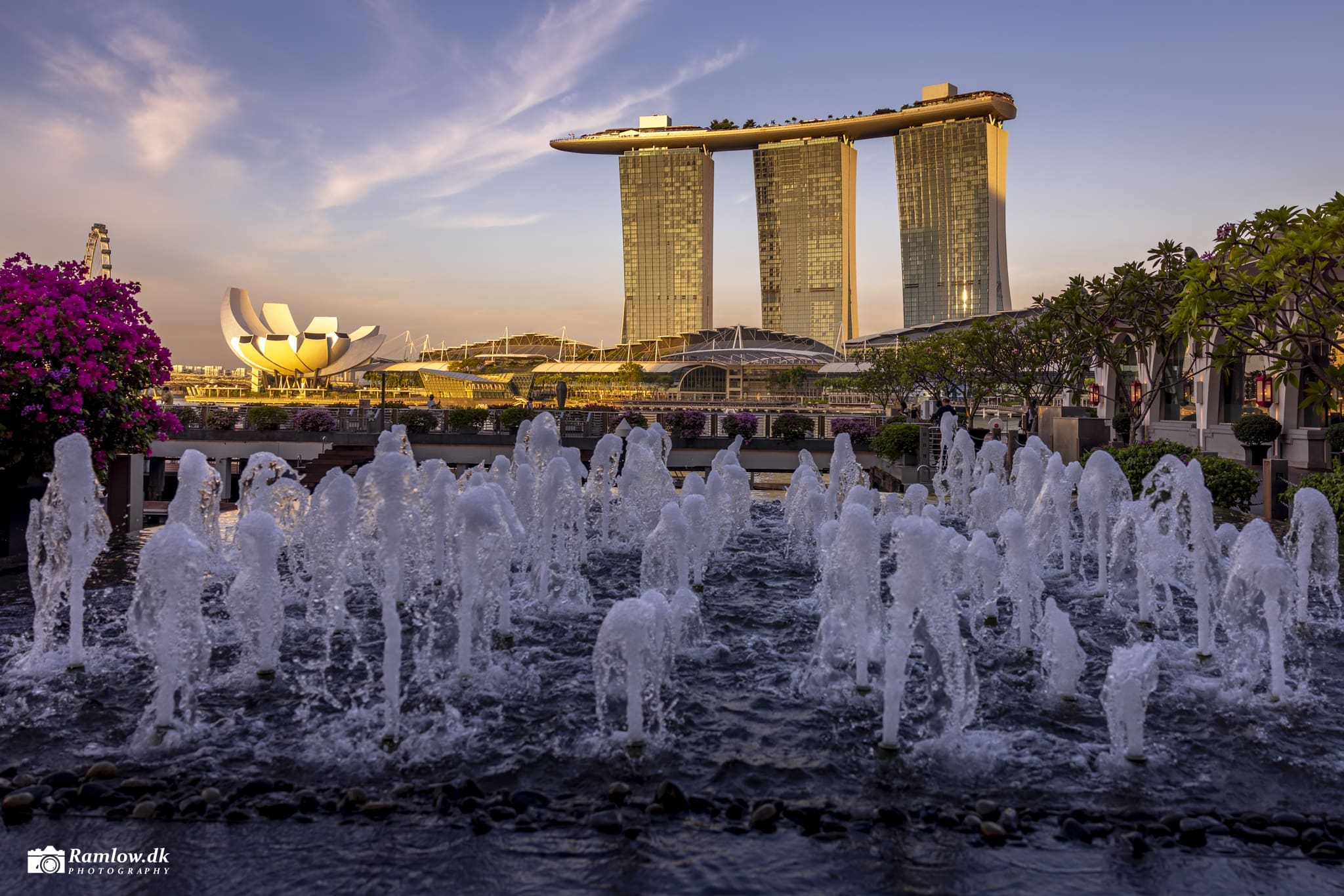 Marina Bay Sands rejser sig dramatisk ved indsejlingen til Marina Bay – det centrale havnebassin i Singapore – hvorfra både og turistbåde sejler op ad Singapore River. På modsatte side ligger det historiske Fullerton Hotel, og kontrasten mellem gammelt kolonialt byggeri og futurisk arkitektur er slående. Her mødes det klassiske og det hypermoderne på få hundrede meters afstand.